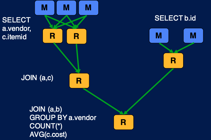 위의 쿼리는 여러개의 map reduce job 으로 나뉘어진다. 하나의 map reduce job 이 다른 job 의 인풋이 되고, 이것들이 조합이 되어 최종적인 쿼리의 결과를 가져올 수 있다.