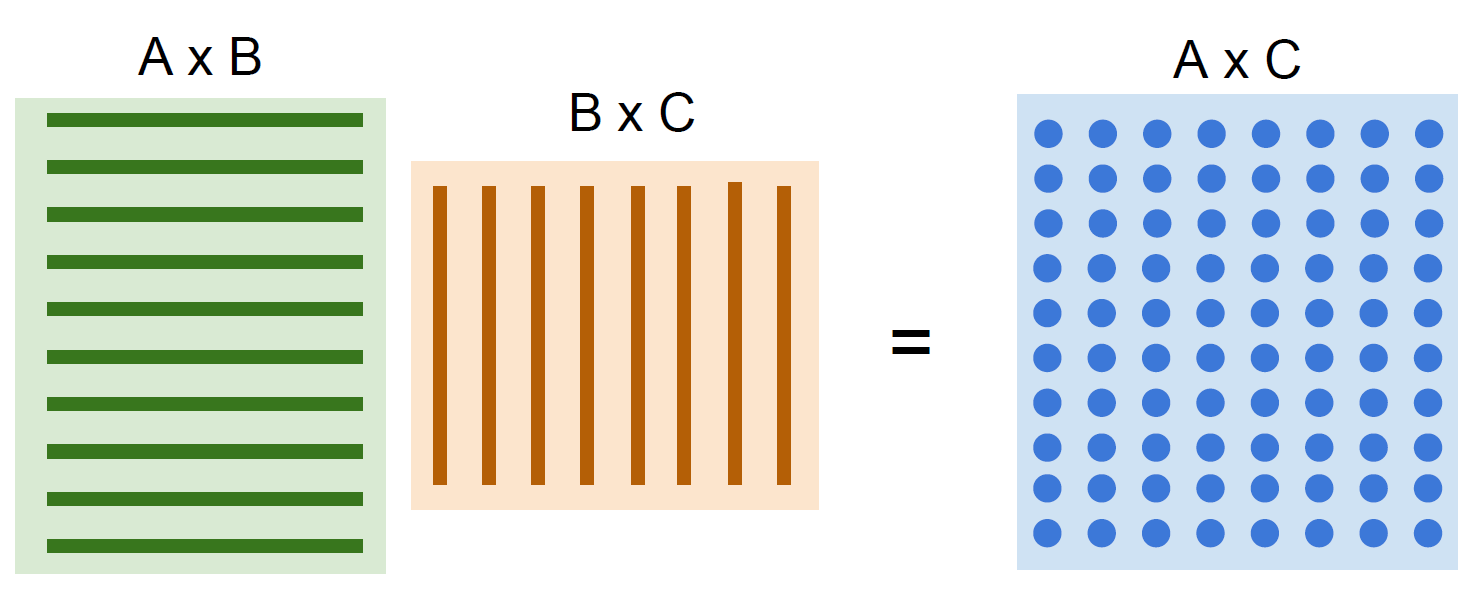 CPU 의 강점은 갖는 것은 여러가지 일 (음악 감상, 영화 감상, 딥러닝, 게임 등)을 할 수 있으며, 순차적인 처리를 빠르게 할 수 있다는 것이다. 반면, GPU 는 여러가지 일을 다 잘하진 못해도 병렬화를 할 수 있다면, 이를 빠르게 처리할 수 있다. 병렬화 가능한 일 중 하나가 바로 행렬 곱 (Matrix multiplication) 이다.