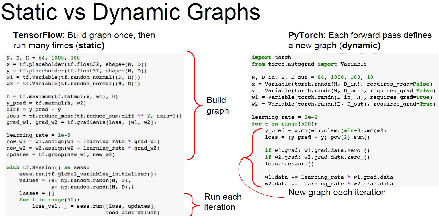파이토치 (https://pytorch.org/) 도 위와 같은 이유로 사용되는 대표적인 딥러닝 프레임워크 중 하나이며 최근 많은 인기를 얻고 있다. 파이토치가 인기를 얻게 된 이유는 기술을 단순화 시켜서 사용하도록 만든 사용 편리성과 함께, '동적 계산 그래프 (Dynamic computational graph)' 를 사용한다는 점이다. 텐서플로우의 경우 정적 계산 그래프 (Static computational graph) 으로 한 번 모델을 만든 후, 여러번 돌리는 방식인 반면, 동적 계산 그래프트는 한 번의 forward path 마다 새로운 그래프를 다시 그린다.