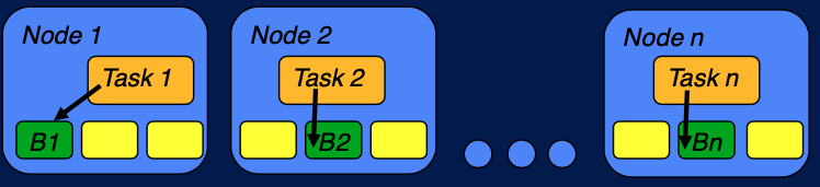 위 그림과 같이 데이터가 node 에 분산되어 저장되어있고, task 가 data node 에 할당되어 처리를 한 후에, 이 결과를 merge 하는 것이 하둡이 어떤 job 을 실행하는 방법이다. 이것이 이전 포스팅에서 언급한 '계산을 데이터로 보내는 것' (computation to data) 의 개념이라고 볼 수 있다. 이러한 방법은 불가능한 것을 가능할 수 있고, 무엇보다 더욱 효율적으로 (빠르게) job 을 처리할 수 있다. 병렬적으로 수행할 수 있고, 데이터의 이동이 최소화되기 때문이다. 하지만 문제는, MapReduce execution framwork 는 Map reduce paradigm 을 구현할 수 있는 application 에만 유용하다. 어떤 application 이 map reduce 를 통해 구현할 수 없는 경우에 문제가 생긴다. 이를 보완하기 위하여 YARN, Tez, Spark 등이 사용된다.