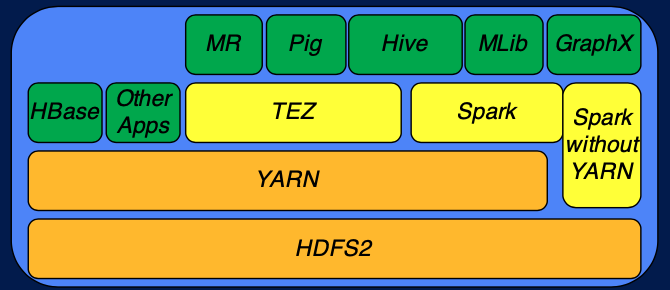 YARN 은 기본적인 Hadoop 의 execution engine 이다. 이 위에 YARN 위에서 동작하는 HBase 와 같은 application 이 있다. 또한 YARN 위에서는 Tez 와 Spark 와 같은 다른 framework가 올라갈 수도 있다. Pig 나 Hive 같은 application 은 TEZ 와 Spark (Hive 의 경우 TEZ와 Spark 모두 이용) 위에서 동작한다. 또한 Spark 는 YARN 없이도 동작할 수 있는 execution framework 이다.