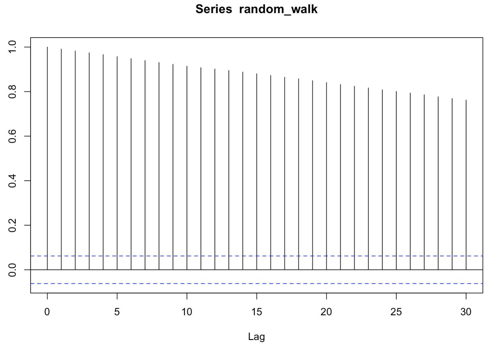 random walk 데이터에서 correlogram 을 그려보자. 인접한 time step 에서 auto correlation coefficient 가 큰 패턴을 보이기 때문에 non-stationary time series 라는 것을 다시 확인할 수 있다.