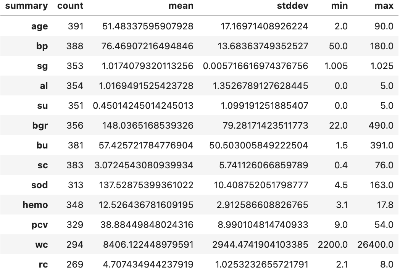 |summary| age| bp| sg| al| su| bgr| bu| sc| sod| hemo| pcv| wc| rc|