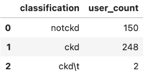 # label 에 'ckd\t' 로 데이터가 잘못 들어가 있는 것을 확인할 수 있다.