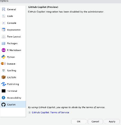 rstudio server 환경에서 github copilot 을 사용하려고 보니 아래처럼