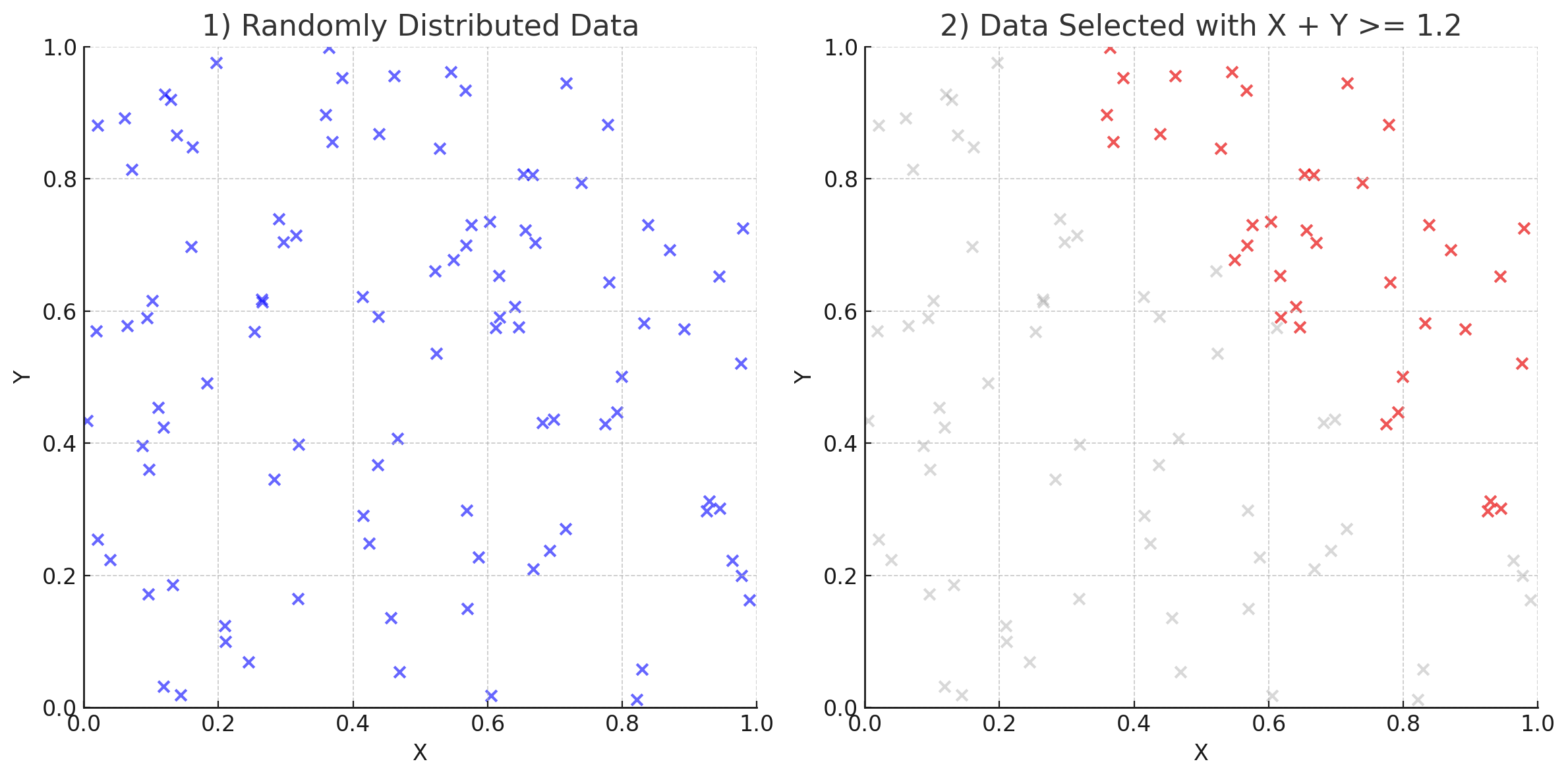 선택편향은 특정 그룹을 선택해서 분석했을 때, 다른 그룹 또는 전체를 대상으로 분석했을 때와 다른 결론이 나오는 것을 의미한다. 아래와 같이 왼쪽 그림에서는 X,Y 의 연관성이 없지만, X+Y가 1.2 이상인 그룹만 선택해서 봤을 때는 X,Y의 음의 상관성이 생기는 것을 알 수 있다. 이러한 선택 편향은 우리의 실생활에서도 많이 발생한다.