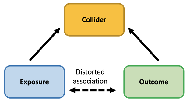 Collider bias는 X와 Y가 모두 영향을 미치는 Z라고 하는 변수가 있을 때, Z를 고정시켜 놓고 보면, X (exposure) 과 Y (outcome) 에 연관성에 편향이 생기는 현상을 의미한다.