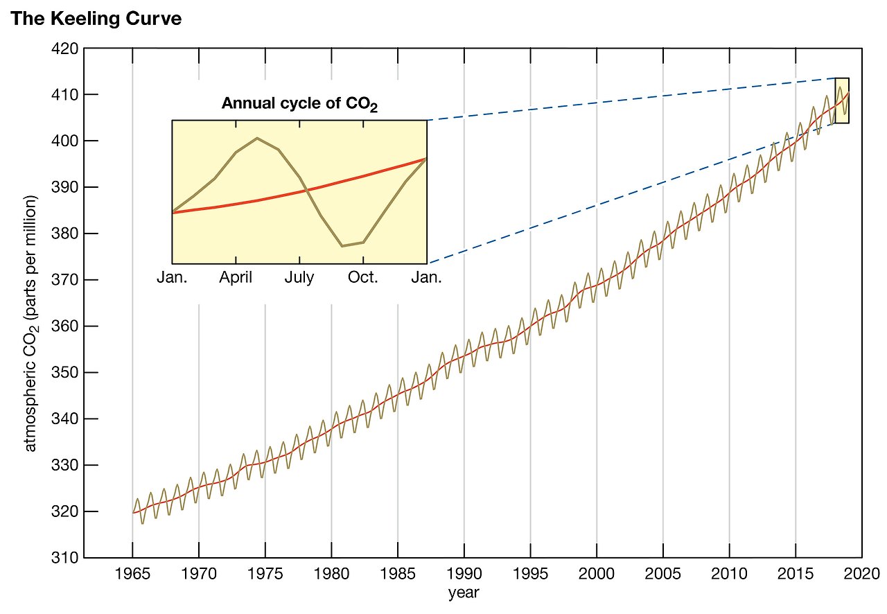 19. The Keeling Curve : 킬링 곡선은 지구 대기의 이산화탄소(CO₂) 농도를 시간에 따라 나타낸 그래프다. 이 곡선은 1958년에 하와이의 마우나로아 관측소에서 대기 중 CO₂를 체계적으로 측정하기 시작한 찰스 데이비드 킬링(Charles David Keeling)의 이름을 따서 명명되었다. 이 그래프는 인간 활동이 지구 기후에 미치는 영향을 보여주는 중요한 지표 중 하나다.