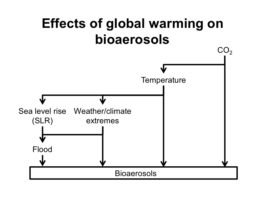 22. 지구 온난화가 bioaerosol 에 미치는 영향 : Global warming 인 아래와 같은 경로로 bioaerosol 에 영향을 미친다.