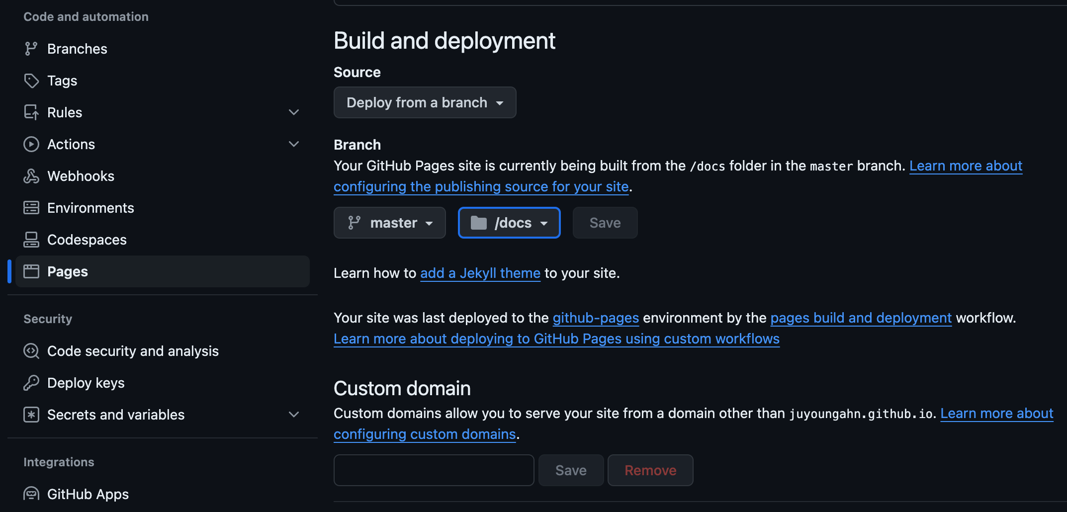 * 또는 output_dir 을 docs 로 설정한 후, github pages 설정에서 source 폴더를 docs 폴더로 설정하는 것을 추천한다.