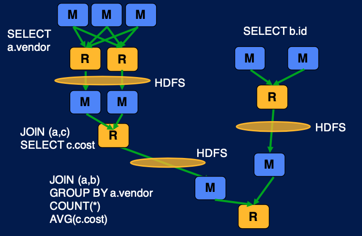 위의 쿼리는 여러개의 map reduce job 으로 나뉘어진다. 하나의 map reduce job 이 다른 job 의 인풋이 되고, 이것들이 조합이 되어 최종적인 쿼리의 결과를 가져올 수 있다.
