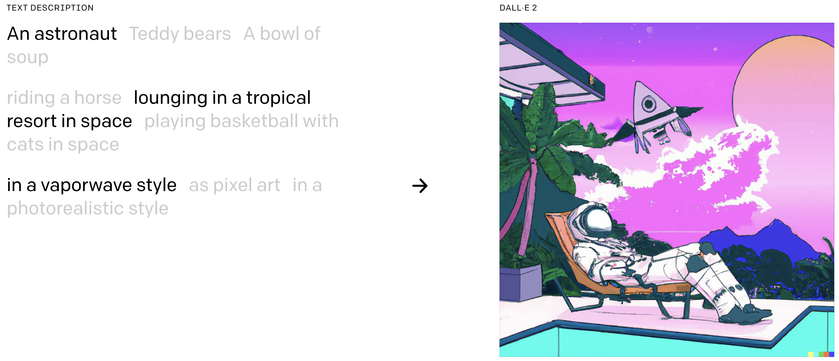 이러한 한계점에도 불구하고 연구자들은 GPT-3 의 multi-modal versions 을 연구하고 있고 (multi-modal 이란 커뮤니케이션 채널이 여러개라는 의미이다.), 그 중 하나가 DALL-E2 와 같은 모델이다. DALL-E2 는 자연어를 인풋으로 받아, 실제적인 이미지를 생성하는 모델이다. GPT-3 는 인풋으로 텍스트를 받아 텍스트를 아웃풋으로 보여주는 모델이라면, DALL-E2 는 인풋으로 텍스트를 받아 이미지를 아웃풋으로 보여준다.