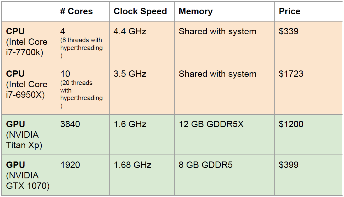 CPU 는 GPU 보다 더 적은 코어를 갖고 있지만 각각의 코어가 GPU 보다 더 강력한 컴퓨팅 파워를 갖고 있다. 따라서 CPU 는 순차적인 작업 (Sequential task) 에 더 강점이 있다. 반면 GPU 는 CPU 보다 코어수는 많지만 각각의 코어가 GPU 보다 더 성능이 낮기 때문에 병렬적인 작업 (Paralell task) 에 더 강점이 있다. 현재 PC 에서 사용되는 CPU 의 코어는 보통 4~10개 정도이며 hyperthreading 기술을 통해 thread 를 2배 정도 늘릴 수 있다. 예를 들어 8 코어 16 threads CPU 의 경우, 병렬적으로 16개의 task 를 수행할 수 있다는 뜻이다. 반면, 예를 들어 NVIDIA 의 Tital XP GPU 의 경우 3840 코어를 갖고 있다. 또 최근 출시된 2080 TI 의 경우 4,352 개의 코어를 갖고 있다. threading 을 감안하더라도 CPU와 GPU 의 코어 수의 차이는 200 배 이상이다.